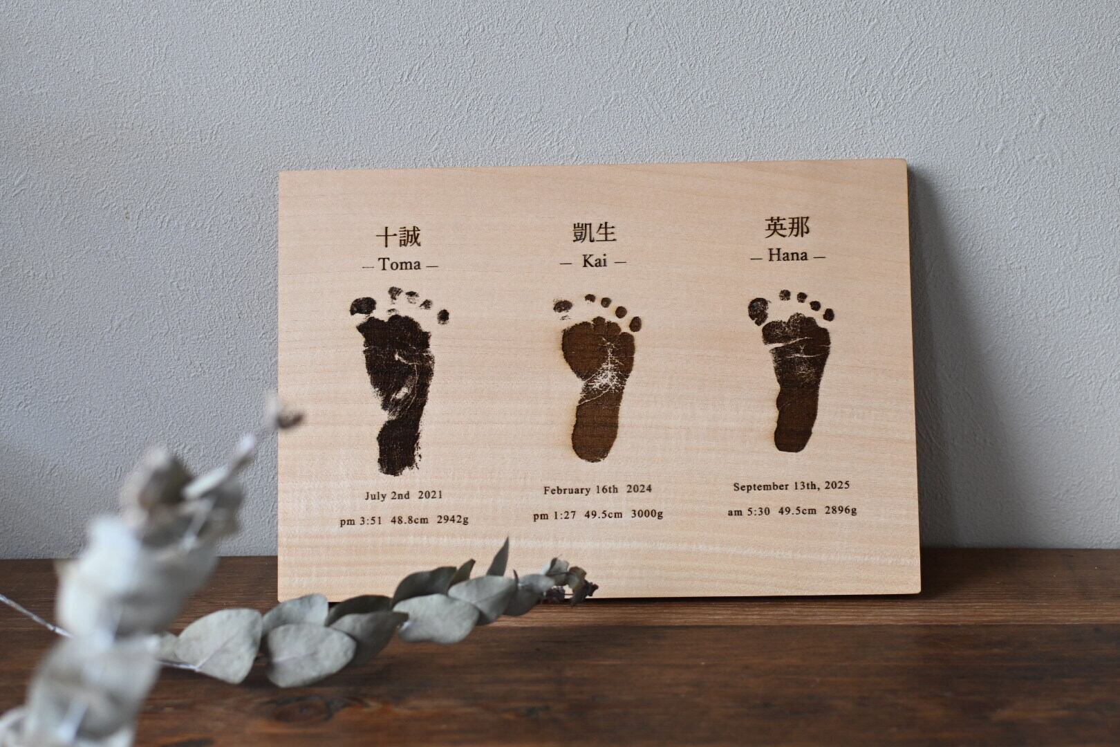 木目の温かさを感じられるように余白を広めにとり、ちょこんとした足形。