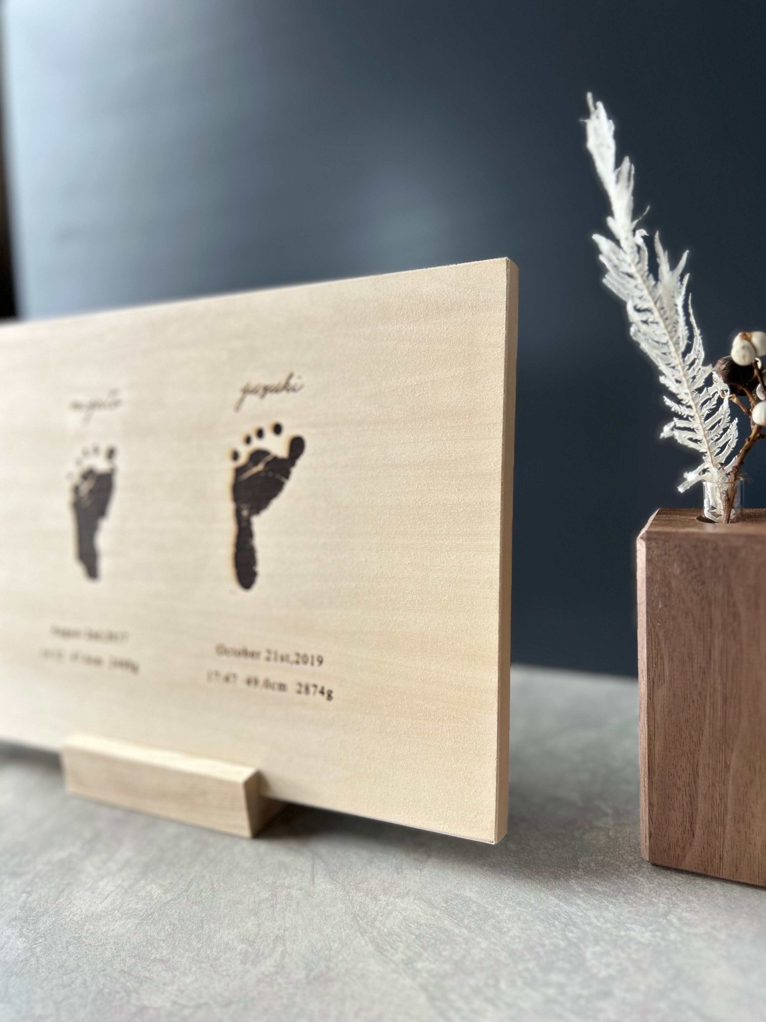 木目の温かさを感じられるように余白を広めにとり、ちょこんとした足形。